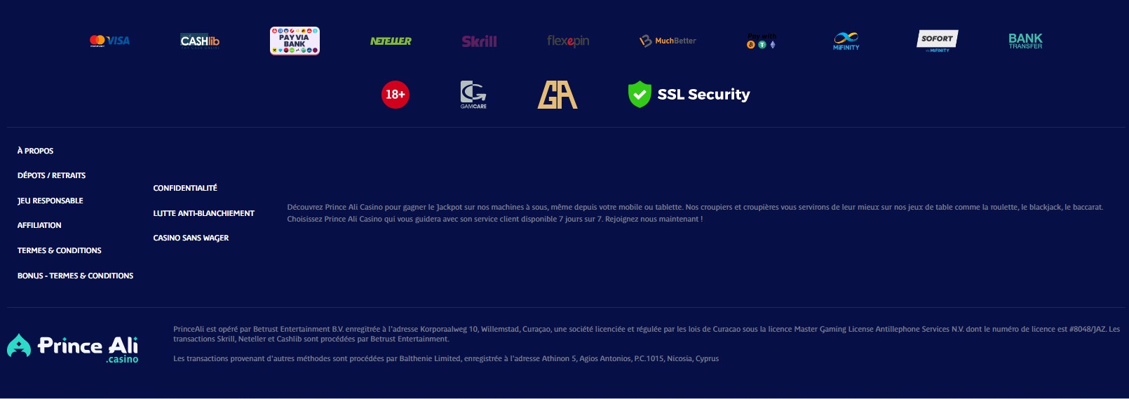 Les moyens de paiement chez Prince Ali Casino sont sélectionnés parmi les plus sécurisés et fiables: Les virements par banque et cryptomonnaies sans aucun frais.